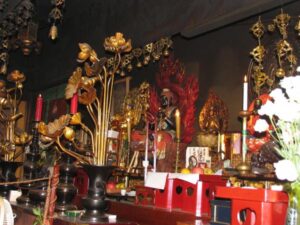 さて本堂に入り、内陣のある二階へと上がらせていただきと中央に、龍が巻き付き炎に包まれた剣をもつご本尊「倶利伽羅不動」様が奉安されています。