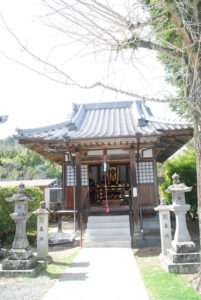 ご本尊・阿弥陀如来をはじめ、観世音菩薩・勢至菩薩・不動明王・毘沙門天の五体がお祀りされ、外には石造りの不動明王も鎮座しています。