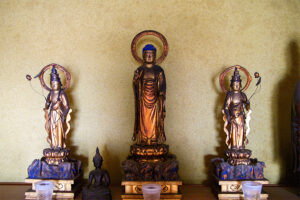 また薬師像は三尊像としてお祀りされることも多く、その際は脇侍に日光・月光菩薩の二尊が従われることが多く、さらに眷属として十二神将も従えることもあります。