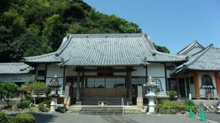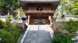 来雲寺は、神功皇后が三韓征討の際に山頂へ宝鏡を捧げて戦勝を祈願したという神話が伝わる、鏡山の麓に建っています。緑濃い境内には四脚門、本堂、位牌堂があり、ご本尊の聖観音菩薩は厨子に安置された秘仏で、奥の祭壇には薬師如来坐像が合祀されています。