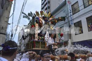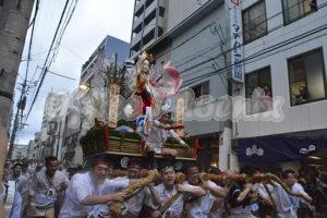 当初は昭和通りで行なわれていましたが、昭和58年からは明治通りの呉服町交差点~天神(福岡市役所)間約1.3kmをこの日に限り、各界の著名人が台上がりを務め、棒さばき役の各流総務ともども舁き手を叱咤激励します。