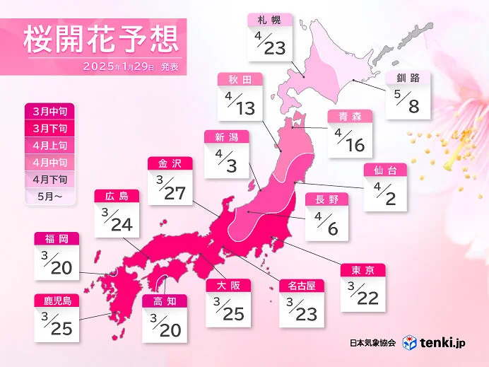 2025年の桜の開花は、桜の開花トップは、福岡・高知で3月20日予想。東京は22日に開花予想。2025年の桜の開花は、西日本は平年並み、東日本では平年並みか早く、北日本は平年より早いと予想されています。