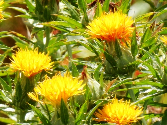 その紅花はキク科の一年草、または越年草でその花期は6月末頃から7月にかけてで、咲き始めは黄色い花ですが成長するにつれて徐々に赤色が増していきます。