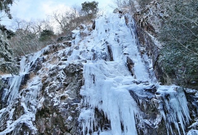 滝の水が凍ると「氷瀑(ひょうばく)」と呼ばれ、引力で勢いよく落下していた水が凍りついて、辺りの情景は動から静へと一転します。